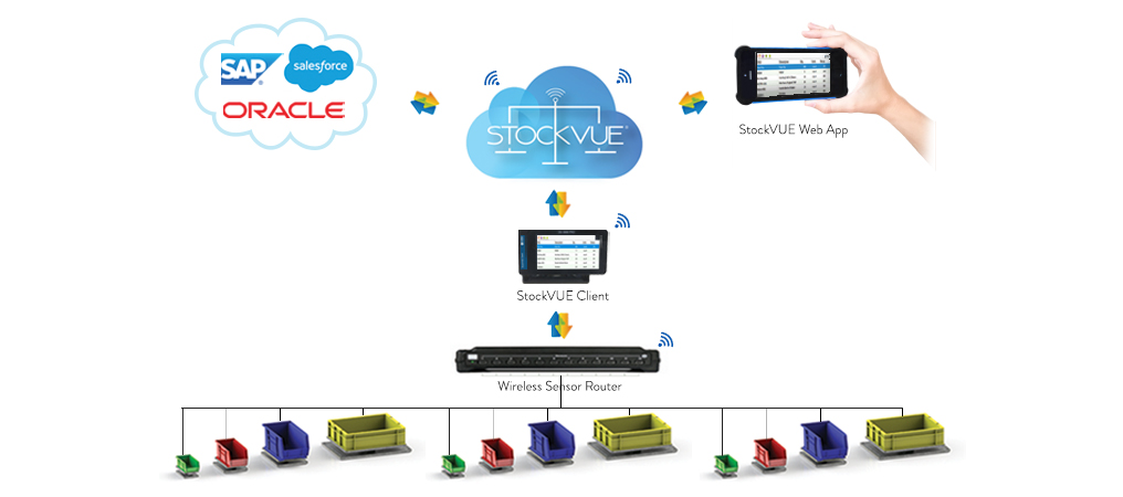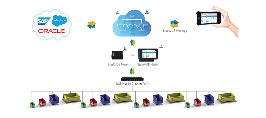 The Node or Node+ IoT Gateway collects data from all routers and uploads it to the StockVUE Cloud. From there one can access data on any Internet connected smartphone or tablet or PC and get alerts sent via email or text messages.
